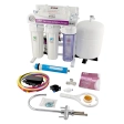 Зворотньоосмотична система - досконала технологія очищення води до бездоганної якості. GRANDO 6+ шестиступінчата система очищення на зручній металевій станині, продуктивністю 75 GPD, манометром для контролю ступеня забруднення картриджів і помпою для підвищення тиску (якщо тиск води в системі водопостачання падає нижче 3 атмосфер - включається насос і працює до повного наповнення водою накопичувального бака). Обираючи саме цю систему - Ви на довгі роки вибираєте смачну очищену воду, повністю безпечну для щоденного вживання. Очищена вода повністю безпечна для щоденного вживання, адже пори мембрани надійно затримують бактерії і віруси. Основний елемент фільтра - мембрана, на яку подається вода під тиском. В результаті вода розділяється на очищену та забруднену, яка зливається в каналізацію. Мембрана пропускає тільки молекули води і розчинений в ній кисень. Після цього чиста вода поступає в накопичувальний бак